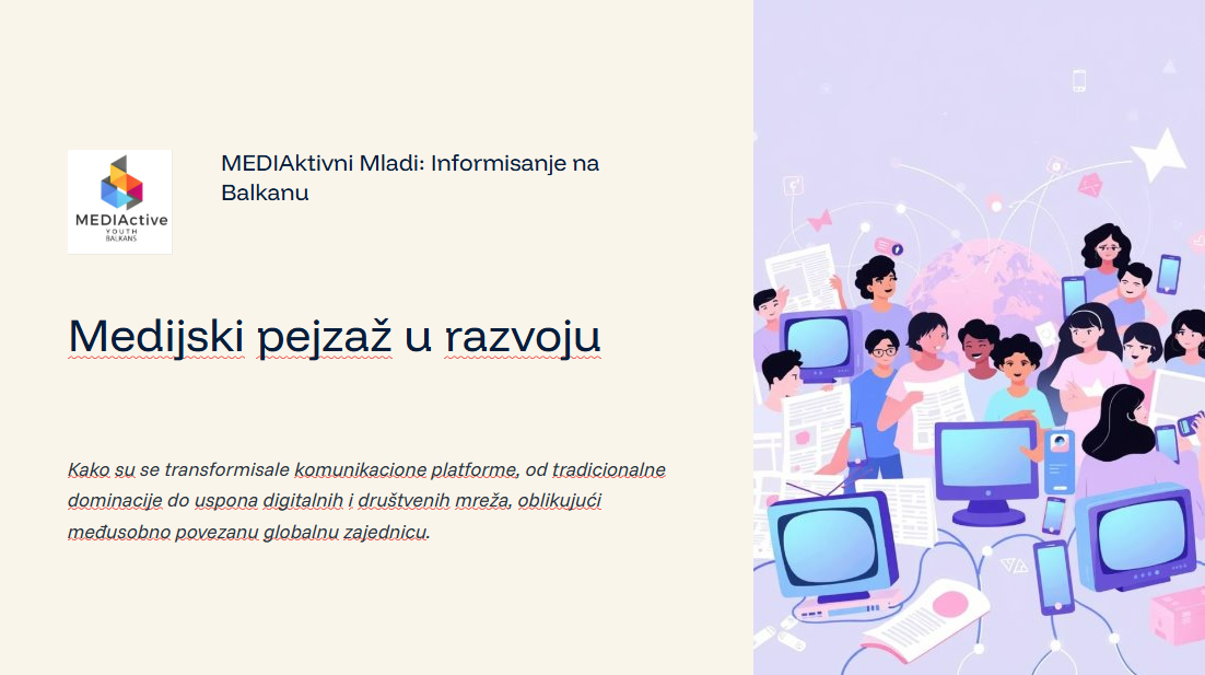 Ova lekcija istražuje evoluciju medija od tradicionalnih do digitalnih platformi, ispitujući njihove posebne karakteristike, uloge i uticaj na modernu komunikaciju. Učesnici će steći uvid u ključne odlike tradicionalnih medija, uključujući štampu, radio-televizijske i outdoor formate, kao i razvoj digitalnih platformi poput veb-sajtova, blogova, društvenih mreža i servisa za strimovanje videa. Lekcija naglašava razlike između jednosmerne komunikacije u tradicionalnim medijima i interaktivne prirode digitalnih platformi, ističući angažovanje publike, pristupačnost, prilagodljivost sadržaja i kredibilitet. Učesnici će razumeti izazove koje donose dezinformacije u digitalnom prostoru i značaj provere činjenica i kritičke evaluacije izvora informacija.